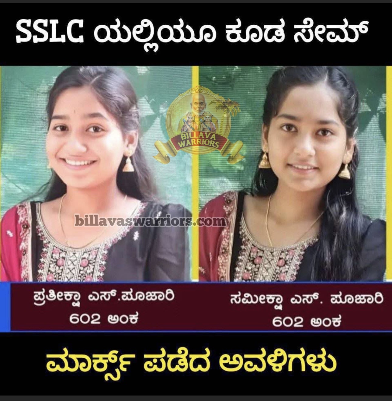 ಈ ಅಪರೂಪದ ಸಾಧನೆ ಮಾಡಿದವರು ಕುಂದಾಪುರ ತಾಲ್ಲೂಕಿನ ಕರ್ನಾಟಕ ಪಬ್ಲಿಕ್ ಸ್ಕೂಲ್ (KPS) ವಂಡ್ಲೆ-ನೆಂಪುವಿನ ವಿದ್ಯಾರ್ಥಿನಿಯರಾದ ಸಮೀಕ್ಷಾ ಎಸ್. ಪೂಜಾರಿ ಮತ್ತು ಪ್ರತೀಕ್ಷಾ ಎಸ್. ಪೂಜಾರಿ. ಪ್ರಕಟಗೊಂಡ ಫಲಿತಾಂಶದಲ್ಲಿ ಇಬ್ಬರೂ ಸಹೋದರಿಯರು ನಿಖರವಾಗಿ ತಲಾ 602 ಅಂಕಗಳನ್ನು ಪಡೆಯುವ ಮೂಲಕ ಶೈಕ್ಷಣಿಕ ವಲಯದಲ್ಲಿ ‘ಅವಳಿ ಪವಾಡ’ ಸೃಷ್ಟಿಸಿದ್ದಾರೆ.